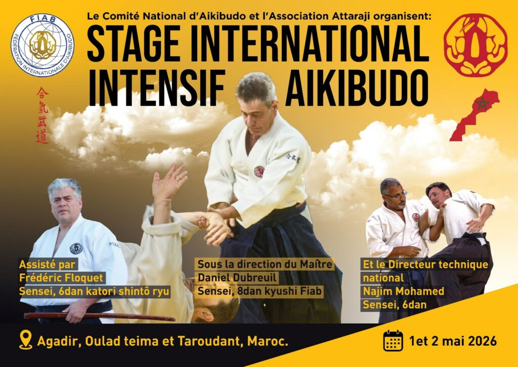 Stage international intensif : sous la direction du Maître Daniel Dubreuil Sensei 8dan kioshi, assisté par Frédéric Floquet Sensei 6dan katori shintô ryu et le Directeur technique national Najim Mohamed Sensei 6dan aikibudo.