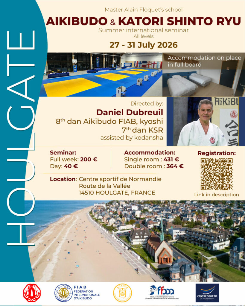 Le stage international d’Aikibudo et de Katori Shinto Ryu aura lieu cette année au CREPS de Houlgate en Normandie du 27 au 31 juillet 2026 sous la direction de Maître Daniel Dubreuil kyoshi assisté des kodanshas présents